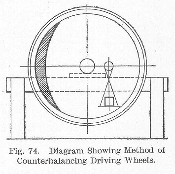 Counterbalance. A study of the construction of the driving wheel brings up the question of counterbalance since it is made a part of the wheel center. The counterbalance, Fig. 72, is the weight or mass of metal placed in the driving wheel opposite the crank to balance the revolving and reciprocating weights.