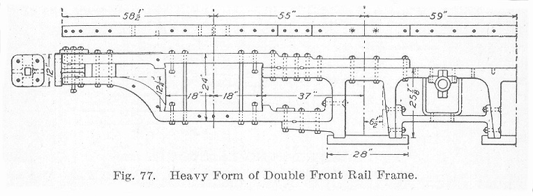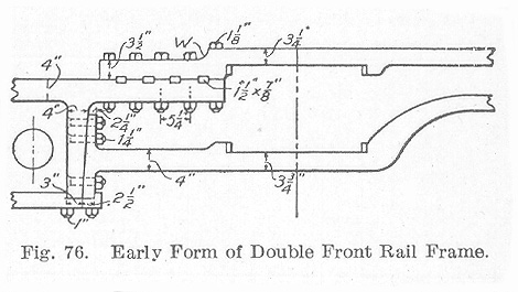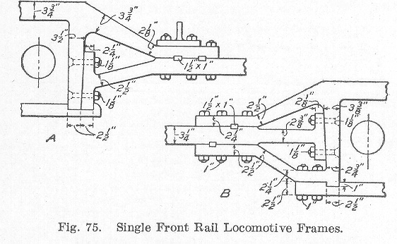 Locomotive Frames. Among other details of importance in the construction of a locomotive, none is more important than the frame. The frame is the supporting element and the tie bar that connects all the various moving and fixed parts. Its present form and proportions are due most largely to development rather than to pure design. It would be extremely difficult to analyze all the various forces to which the frames are subjected. There are two principal classes of locomotive frames, namely, the single front rail and the double front rail. The single front rail is illustrated in Fig. 75. At first the joint between the main frame and the front rail was made as shown at A in Fig. 75. The rear end of the front rail was bent downward with a T-foot formed thereon by means of which it was connected to the main frame. The top member of the main frame was bent down and extended forward and connected to the front rail by means of bolts and keys. The T-head was fastened to the pedestal by two countersunk bolts. As locomotives grew in size, much trouble was experienced due to the countersunk bolts becoming loose or breaking. To overcome this difficulty, the form of joint shown in B, Fig. 75, was developed. Here the pedestal had a member welded to it which extended forward and upward to meet the front rail. The top member extended outward and downward as before. The front rail fitted between these two members and had a foot which rested against the pedestal. This latter form was used for many years, being changed in details considerably but retaining the same general arrangement. These forms of single bar frames continued to be used for many years and are employed at the present time for light locomotives. When the heavier types of locomotives, such as the Consolidation made their advent, it became necessary to improve the design of the frame. To meet this necessity, the double front rail frame was developed. Fig. 76 illustrates one of the earlier forms of this frame. The top rail was placed upon and securely bolted to the top bar of the main frame and the lower front rail was fastened to the pedestal by means of a T-foot with countersunk bolts. The same difficulty was experienced with this design as with the first form of the single front rail type, namely, the breaking of the bolts fastening the lower bar to the pedestal. This led to experiments being tried which resulted in many stages of advancement until a heavy and serviceable design was developed, as shown in Fig. 77. In this design the pedestal has a bar welded to it on which the lower front rail rests and to which it is connected by means of bolts and keys. The top front rail rests on top of the top main frame and extends back beyond the pedestal, thus giving room for the use of more bolts. The design shown in Fig. 77 is the one largely used on all heavy locomotives, it being slightly changed in detail for the various types.In addition to the two general types of bar locomotive frames which are made of wrought iron or mild steel, a number of cast-steel frames are being used. The general make-up of the cast-steel frame does not differ materially from that of the wrought iron except in the cross-section of the bars. The bar frame is rectangular or square in cross-section whereas the sections of cast-steel frames are usually made in the form of an I.