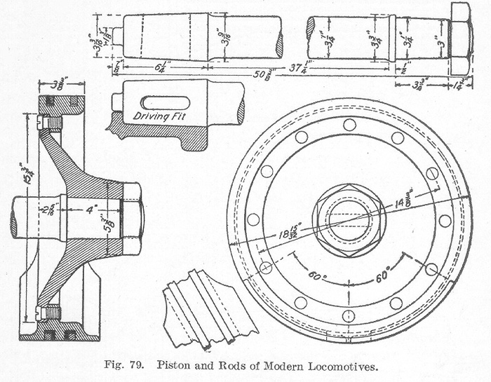 The Piston and Rods. The pistons of locomotives vary greatly in details of construction but the general idea is the same in all cases. Since the pistons receive all the power the locomotive delivers, they must be strongly constructed and steam tight. All pistons consist of a metal disk mounted on a piston rod which has grooves on the outer edges for properly holding the packing rings. The pistons are commonly made of cast iron, but where great strength is required, steel is now being used. Fig. 79 illustrates the present tendency in design. The cylindrical plate is made of cast-steel and the packing rings, two in number, are made of cast iron. The packing rings are of the snap ring type and are free to move in the grooves.As can be seen, the rim is widened near the bottom in order to provide a greater wearing surface. Fig. 79 also clearly shows the method used in fastening the piston to the piston rod. The piston rod is made of steel and has a tapered end which fits into the cross-head where it is secured by a tapered key. The crosshead fit is made accurate by careful grinding. The crosshead key should likewise be carefully fitted.