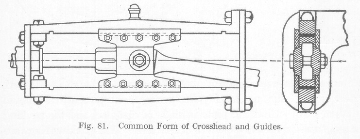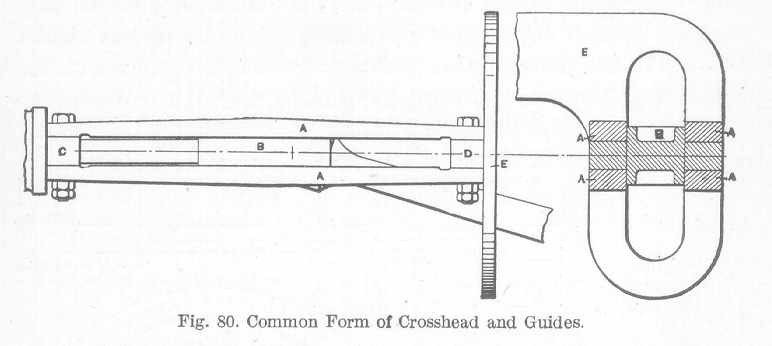 Crossheads and Guides. A variety of forms of crossheads and guides are now found in use on locomotives, two of the most common of which are illustrated in Fig. 80 and Fig. 81. The form illustrated in Fig. 80 is known as the 4-bar guide and that shown in Fig. 81, as the 2-bar guide. The form used depends largely on the type of engine. The 4-bar guide now used on light engines consists of four bars A which form the guide with the crosshead B between them. The bars are usually made of steel and the crosshead of cast-steel having babbitted wearing surfaces. The 4-bars A are bolted to the guide blocks C and D which are held by the back cylinder head and the guide yoke E, respectively. The guide yoke E is made of steel, extends from one side of the locomotive to the other, is securely bolted to both frames, and serves to hold the rear end of both guides. There is usually a very strong brace connected to the guide yoke which is riveted to the boiler. The wrist pin used in the crosshead of the 4-bar type is cast solid with the crosshead.The 2-bar guide consists of two bars, one above and one below the center line of the cylinder with the crosshead between them. In this type the parts are more accessible for making adjustments and repairs and the wrist pin is made separate from the crosshead.