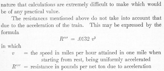 S = speed in miles per hourThe force for starting is, however, about 20 pounds per ton which falls to 5 pounds as soon as a low rate of speed is obtained. The resistance due to grades is expressed by the formula