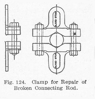 Broken Connecting Rod. If a connecting rod is broken without injury to the cylinder, the crosshead and piston should be blocked at one end of the stroke and the broken parts of the rod removed. The removal of the side rods depends upon the extent of injury to the crank pin on the broken side. All side rods should be left in position if the crank pin on the broken side is uninjured, otherwise all should be removed. The valve rod should be disconnected from the rocker arm and the valve stem clamped with the valve in the cental position. The valve stem may be clamped by screwing down one of the gland nuts more than the other, thus cramping the stem. It may also be secured by the use of the clamp shown in Fig. 124. This consists of two parts having V-shaped notches which are securely fastened to the valve stem by a bolt on either side. This is done after having passed the gland studs through the two slotted holes, which prevents any longitudinal movement of the stem after the nuts on the studs have been screwed home. The crosshead should be forced to one end of the guides with the piston against the cylinder head. In this position, it can be secured by a piece of wood cut to fit snugly between it and the guide yoke.