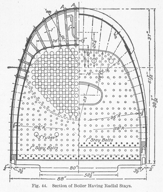 Flues. From the sectional view of the boiler illustrated in Fig. 32(See page 27 for figure and associated index) and Fig. 44, it is evident that a large part of the boiler is composed of flues or tubes. The flues give to the boiler the largest part of its heating surface. It is the flues which largely affect the life of the boiler and, therefore, the life of the locomotive, for this reason it is quite necessary to properly install and maintain them. A large amount of the repair costs is directly traceable to the flues. This is especially true in localities where water is found which causes scale to form on the flues from 1/16 to 1/2 inch in thickness, thus causing unequal expansion and contraction and overheating. These conditions cause the joints to break at the flue sheets. Cold air entering the fire-box door is another source of flue trouble. It is to these details that careful attention must be given in order to alleviate flue failures. Flues should be made of the best quality of charcoal iron, lap-welded, and subjected to severe tests before being used. They must be accurately made, perfectly round and smooth, must fill standard gauges perfectly, must be free from defects such as cracks, blisters, pits, welds, etc., and must be uniform in thickness throughout except at the weld where 2/100 of an inch additional thickness may be allowed. The present practice is to use tubes of from 2 to 21¼ inches in diameter. They vary in length from about 15 to 20 feet, the length depending on the construction of the boiler and locomotive as a whole. The tubes are supported at each end by letting them extend through the tube sheets. It is in the setting of the tubes that great care should be exercised. The tube sheets must be carefully aligned and the hole drilled through and reamed. These holes are usually made 1/16 of an inch larger in diameter than the outside diameter of the tubes. The tubes should be made not less than 1/4 nor more than 3/8 inch longer than the gauge distance over the front and back flue sheets. All back ends of tubes should be turned and beaded, and at least ten per cent of those in the front end. The number of tubes used varies according to the type and size of the locomotive but usually from 300 to 500 are employed. The flue sheets are made thicker than the other sheets of the boiler in order to give as wide a bearing surface for the tubes as possible. They are usually 5/8 inch thick. The flue sheets are braced or stayed by the flues and by diagonal braces fastened to the cylindrical shell. The bridges or metal in the flue sheets between two adjacent flues are usually made from 3/4 to 1 inch in width. The greater the width of the bridges, the greater the space between the flues; therefore, better circulation will be obtained.