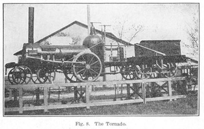 The Tornado was the second locomotive owned by one of the parent lines forming a part of the Seaboard Air Line Railroad. This locomotive was imported from England and put into service in March, 1840. It has two inclined cylinders 9 inches in diameter with a common stroke of 20 inches and a single pair of drivers 54 inches in diameter. The fire-box stands upright and is cylindrical in form, while the boiler proper is horizontal and but 34 inches in diameter. The steam is admitted to an exhaust from the cylinders by plain slide valves controlled by the Hook motion.