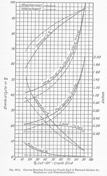 The conditions for both the head end and crank end of the forward motion, in both Stephenson and Walschaert gears are represented in Figs. 69-a and 69-b. Each event of the cycle-valve travel, port opening, and lead-is plotted with reference to the cut-off. As can be seen, the Walschaert gear gives for all cut-off positions a later admission, later release, later compression, less lead, less port opening, and less valve travel than does the Stephenson gear. With the exception perhaps of lead, the differences are negligibly small for all cut-off positions beyond 50 per cent. With cut-off positions less than 50 per cent, however, these differences increase quite rapidly.