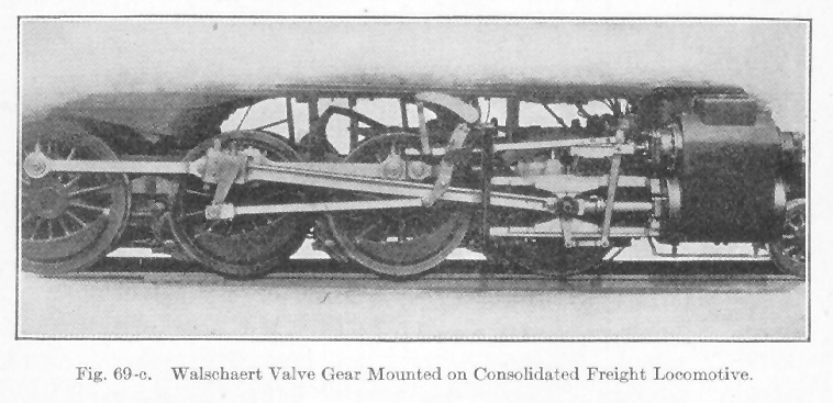 The Walschaert gear is applied to a locomotive in several ways, each having its own advantages. The method illustrated in Fig. 69-c gives the student a general idea how the scheme is worked out and applied in connection with a consolidative freight locomotive.