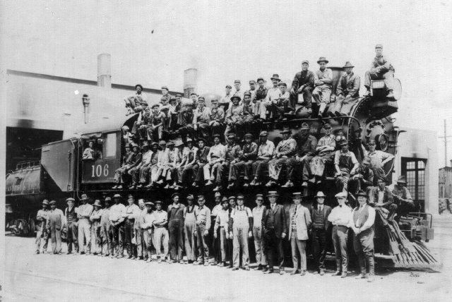 SD&A 2-8-0 #106 in front of the San Diego engine house with most of the staff in the early 1920's.
