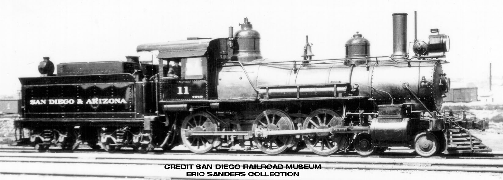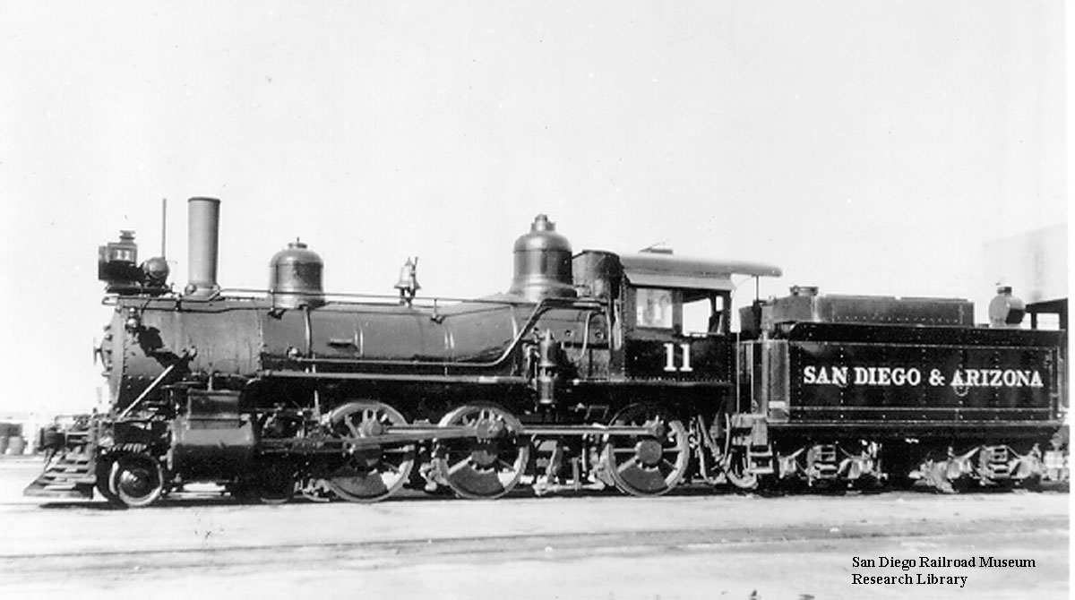 Built as Southern Pacific of California #196. Sold to Southern Pacific and numbered #1674 then #2112. Sold to San Diego and South Eastern and numbered #22. Then became San Diego and Arizona #22 in the merger of October 1917. Renumbered #11 January 1920. Scrapped December 1925.