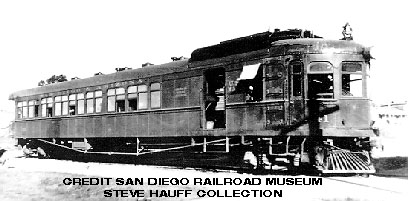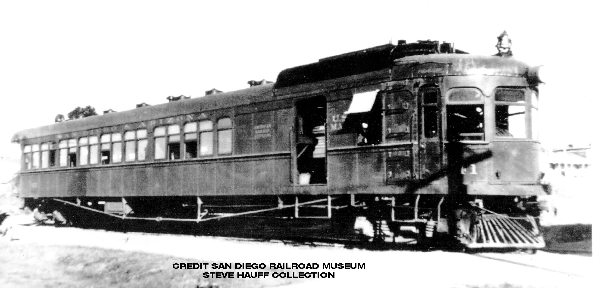 Gas-electric railcar. Ex Minneapolis, Northfield & Southern No. 11. Single end, open platform. 70 feet long. Seated 91. Purchased from San Diego and Southeastern in 1917 and numbered 41.