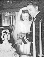 Pictured are Lieut. and Mrs. Roy L. Bouque (Alberta Barbara Mundo) following their wedding in San Diego Jan. 3. Bouque was formerly of West Oakland Stores. Tiered wedding cake was cut with sword her father used in World War I.