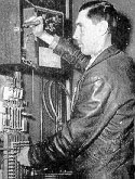CLYDE CROPLEY, lineman, repairs a telegraph and telephone terminal block at Tecate station.