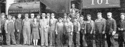 SAN DIEGO ROUNDHOUSE forces are shown below, l to r: H. L. Annis, V. T. Hurtt. E. L. Swearingen, M. T. Palmer, H. M. Harrell, R. M. Hill. A. L. Bloom. Hertha Conway, R. Miskolczy, T. P. O'Connell, asst. master mechanic; A. L. Smith, W. C. Cameron, chief clerk; Rosa Huerta, Alex Dalgleish, Katie Magallanos, Sam Martinez, H. L. Baytiss, Mary Parra, A. L. Strader, Billie Apodaca, Carlos Castro, John Holland, Stanley Aitken, Fairon Purser.