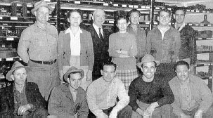 Freight clerks and warehouse crews, center, include, front row, l to r: George Scott, Larry Cummings, Jane Schellenberger, Leta Stacey, Maybelle Webb, Woodie Jeffries, Joe Lee. Back row: Clarence Gilmore, Manuel Garcia, Bob Yenawine, Jack Wil-kinson, Wyatt Smith, P. E. Mottram, Richard Love.