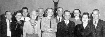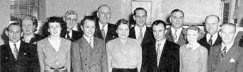 GENERAL OFFICE workers, left, Include, front row, l to r: Nelle Grosdidier, Sadie H. Nichols, Ruth Sundstrom, S. A. Lamey, trainmaster; Edris Dull. Back row: G. B. Stilson, J. W. Grosdidier, F. M. Gay, A. B. Raine, chief clerk; Joyce Alien, Pete Palma. Lamey is operating officer in charge of train and yard service and stations on SD&AE.