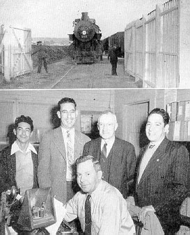 YARD OFFICE, STORES AND FREIGHT SHED crews are shown in the three pictures at right. At the yard office are, top. l to r: Jerry Green, "Sunnie" Hammett, A. A. Wyttenbach, Vernon Rook. Charles Y. McKee, asst. trainmaster.