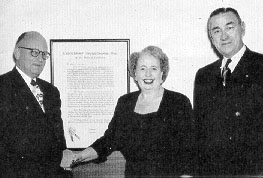 CONGRATULATIONS to Floy Richmond, secty. to traffic manager, SD&AE Ry., on her election to presidency of the San Diego Chapter of Executives' Secretaries, Inc., are given by George Hansen, passenger traffic mgr., LA, and Floy's boss, Tom Fielding, who also is DF&PA for Southern Pacific. Floy was installed as the newly-organized Chapter's first president on April 15.