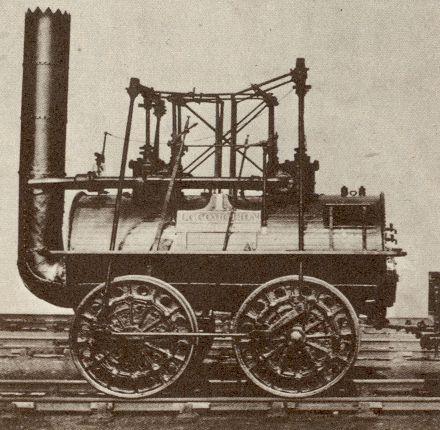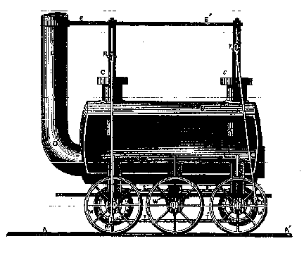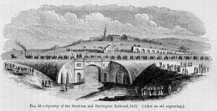| 1825: | Stephenson's 8-ton LOCOMOTION No. 1 built for the Stockton & Darlington Railroad. Capable of pulling 90 tons of coal at 15 mph. Stephenson plans all details of the line, and even designs the bridges, machinery, engines, turntables, switches, and crossings, and is responsible for every part of the work of their construction. (The passenger coaches of this time were all drawn by horses.) |