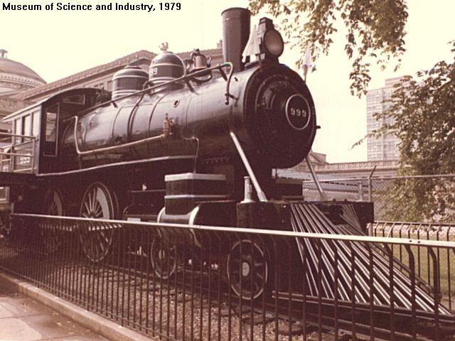 | 1893: | On May 10th locomotive #999 of the New York Central & Hudson River RR hauled four heavy Wagner cars of the Empire State Express down a 0.28% grade at record-breaking speed. Although unverified, the conductor timed the speed at 112.5 mph over 1 mile, and at 102.8 mph over 5 miles. This 4-4-0 had 86" drivers for this run, and was later fitted with more normal 78" wheels as it now has on museum display. |
