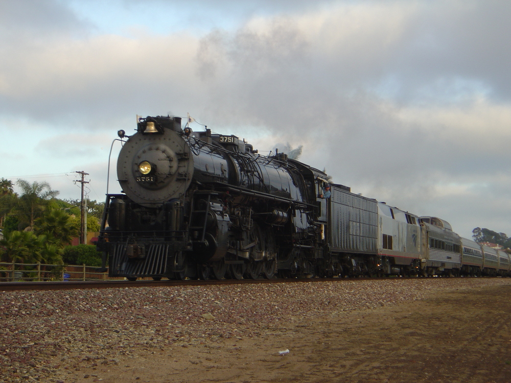 Santa Fe #3751 Visits San Diego As the iron monster roared into town, in the cab window was Amtrak honcho Ron Hyatt. Yes, THAT Ron Hyatt, PSRM's mechanical department chief! Next to him was Bob Kittel as 3751 doesn't go anywhere without him! On the ground chasing was nearly every serious rail fan in Southern California and just about every PSRMA member who had kept their ears to the rail listening for this special run. Many more PSRM types bought a ticket to ride the sold out special excursion.