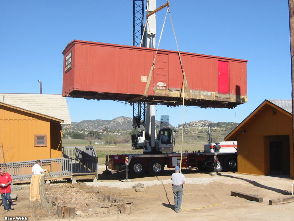 The first project was moving the ancient wooden boxcar that has been sitting next to the Campo Depot for approximately 93-years. It served as the Museum's movie theater since the mid 1980s. Our new restroom building requires that we lay a brick walkway from the Depot, and the boxcar theater had to be moved out of the way.