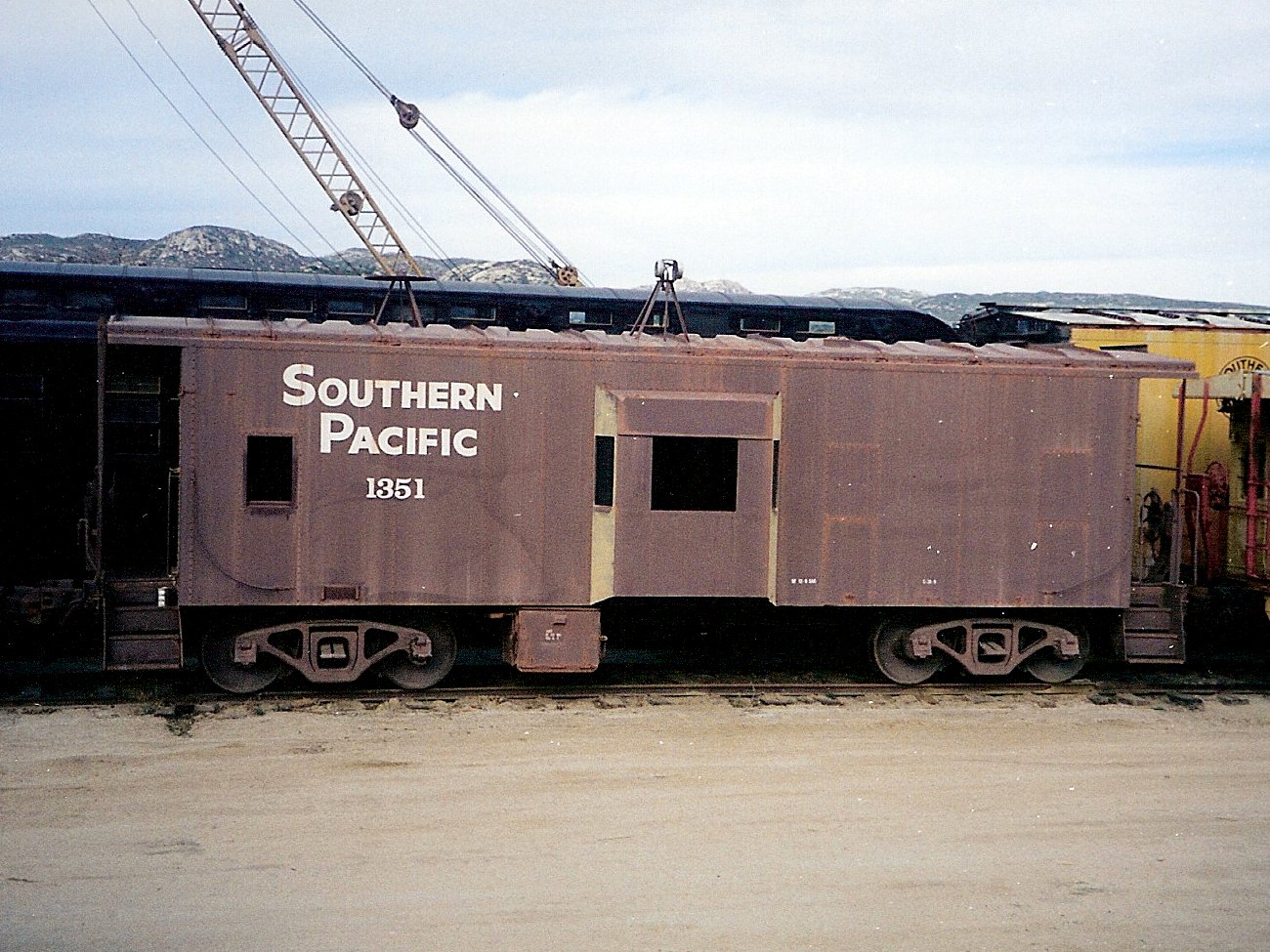 While stored at Grossmont, SP #1351 was knocked through a bumper post and across a paved parking lot in a 1985 switching accident. The damage was repaired by the railroad, and SP #1351 was cleaned and painted Mineral brown with Daylight orange ends and end-facing bay window panels by Museum members. It was taken to San Ysidro by the SD&IV, and to Campo February 28, 1987 on "Great Freight II".