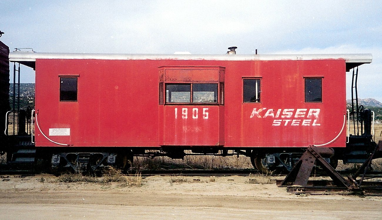 Kaiser had two home-built cabooses on the heavy-duty freight-only railroad. In the 1970s, "original" KS #1905 was being rebuilt after major frame damage, when work was halted. Shot up and vandalized, it was later sold, and is now displayed at Ragsdale's Desert Center Cafe in Desert Center, CA, 12 miles south of Eagle Mountain. The other caboose (KS #1918?), had been stored at Ferrum and vandalized, and was moved to Eagle Mountain and rebuilt by Kaiser shop workers. Renumbered "new" KS #1905, its metal toolbox and its wire alternator cage are from "original" KS # 1905, which had slightly larger windows.