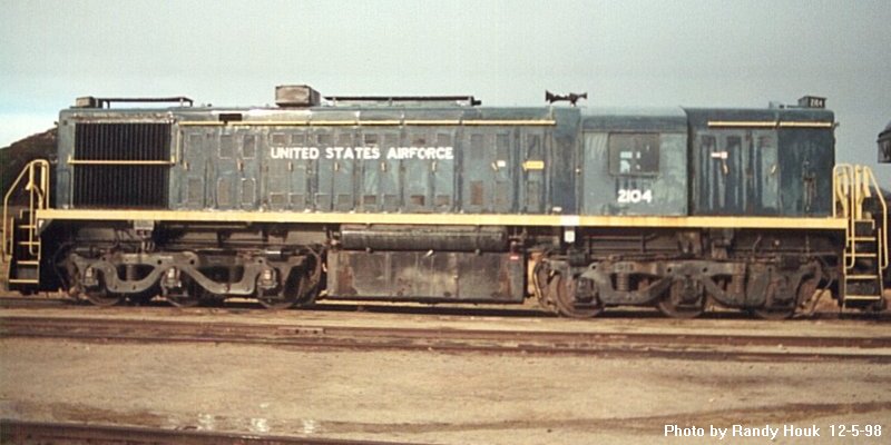 In January 1979, it was put back in operating condition for transfer to the Air Force, renumbered USAF #2104, and painted Air Force blue with yellow trim, black underframe, and white letters. On January 26, 1979 it was sent to Vandenberg AFB near Lompoc, Ca. to replace EMD MRS-1 USAF #1809 (now also museum-owned). USAF #2104 was operated by Chemical Systems Division of United Technologies, a civilian firm, and moved Titan missile part shipments two or three times a year from the SP mainline near Surf, Ca., the SLC-5 complex at South Vandenberg. Usually idle, in 1982 USAF #2104 was moved to an enginehouse 11 miles away in the main section of Vandenberg AFB.