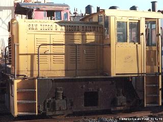 On April 26, 1985 the switcher was leased by Babcock & R.W.B. Party Props to the PSRMA for $ 1 a year. Babcock had it repainted yellow with red pinstripes; black handrails, steps, and underframe; and black-&-white safety striping on its lower end plates. "8157" was painted on the cab sides and rear, "San Diego & Arizona Railway" on its upper hood sides, and SD&A decals were affixed beneath the cabside numbers. Added in very small letters were "RWBX" & "Xl528" on the rear of the cab, and "Leased by North County & Pacific Creek Railroad, Fallbrook, Ca." on the cab sides. SDA #8157 was trucked to Campo in 1985, and was donated to the SDRM in December 1988 by Robert & Lori Babcock. Designated the museum's shop switcher, it's now kept near the museum's carbarn at Campo.