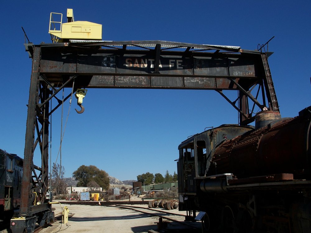 This steel structure was used for decades to lift cars at the Santa Fe's San Diego yards, and is again being used for that purpose by the museum in its Campo yard.With a lifting capacity of 25 tons, this gantry crane is 28’ high and over 40' wide. It stands on two steel legs each 19' wide at their bases, and rolls along rails with a track gauge of 37'9". It can straddle several railroad tracks. It weighs approximately 20,000 lbs. (10 tons). It has electric traction motors at the foot of each of its two legs, which are powered by current from four overhead catenary trolley wires running above a wooden control shack on one end of the crane. It has considerable rigging gear that rolls along the top of the crane. Santa Fe cross-in-circle-in-square emblems and "Santa Fe" are painted on its sides, as well as "25 Ton Cap.”