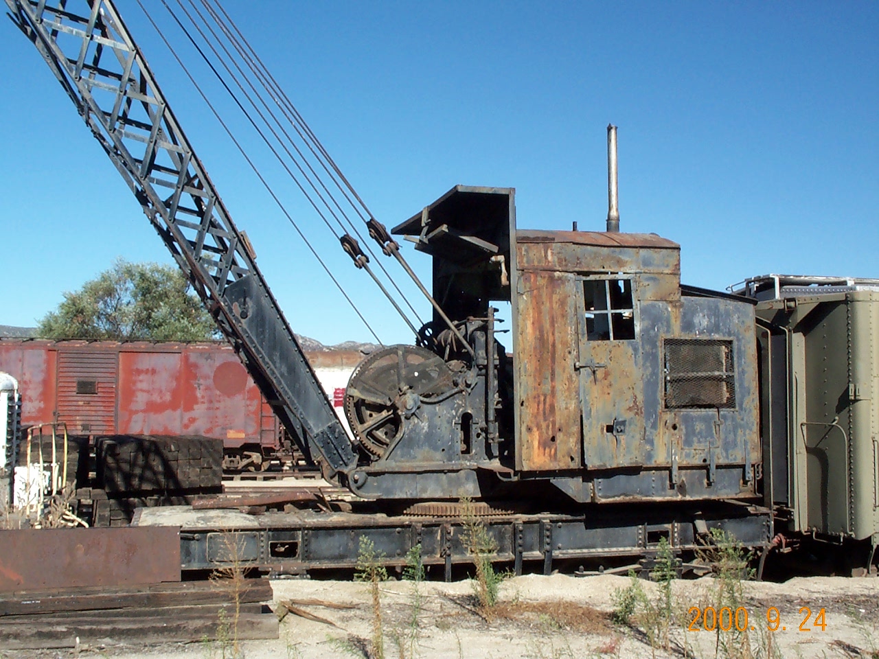 According to plates riveted to both sides of its frame, this self-propelled locomotive crane was builder's #7036, with a 31,500 lb. (15.75 ton) lifting capacity @ a 15-foot radius. Originally steam- powered, it was converted to diesel power around the 1940s with a Cummins engine and had its boom reinforced, increasing its lifting capacity to about 40,000 lbs. (20 tons). As the other locomotive cranes in its class were converted to full electric power, #7036 is unique and a historic rarity. Its boom can traverse 360 degrees and it can move itself under its own power, hence the "locomotive" name. Its builder later became the Industrial Brownhoist Division of the American Hoist & Derrick Company.