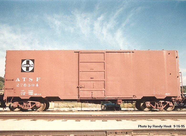 ATSF #276594 was one of 250 boxcars in Santa Fe's Bx-52 Class, Lot #5879, which were numbered #276500-276749. The car is 40'8 1/4" long over end sills, 9'5 1/2" wide over eaves, and 14'4 7/8" high to top of eaves. Its centered single sliding doors are 6'0" wide and 9'11" high. The interior is 40'6 1/16" long, 9'3 15/16" wide, & ll'O 3/8" high at the center. It weighs about 43,803 lbs. (21.90 tons), and has a 110,000-lb.(56-ton) capacity in its 3,973 cuft of cargo space. It has a rooftop handbrake wheel at the rear, and originally had rooftop walkways and two high ladders each at diagonally opposite ends of the car, one on the side and one on the end. After rooftop walkways were banned for safety in 1968, the front (non-brakewheel) ladders were shortened about 1971, with only the lower half retained. In 1987, museum workers removed the rest of the front end's side ladder, giving it a unique look. The high ladders are still on the rear end for brakewheel access.