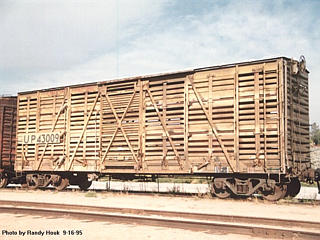 UP #43009 was renovated at Albina in 1976 to allow in-car feeding and watering of the hogs. Shutters were installed on the sides to control inside temperatures all year and permit the elimination of straw bedding in the winter and allow sand bedding all year round. It was serviced by the UP at Omaha, NE in February 1974, January 5, 1984, and September 1985. It was one of two UP stock cars seen at Rogers, NE (near Omaha) on September 22, 1989 by a museum Board of Trustees member. In an unusual coincidence, when the Union Pacific donated a stock car to the PSRMA in December 1989 after a request for such a donation by the museum's Acquisitions Director, it was one of those cars! UP #43009 was brought to Colton, CA by the UP and to San Diego by the Santa Fe. It was moved by the SD&IV to San Ysidro and stored outside its engine house there until brought to Campo in February 1990 by the SD&IV on "Great Freight III".