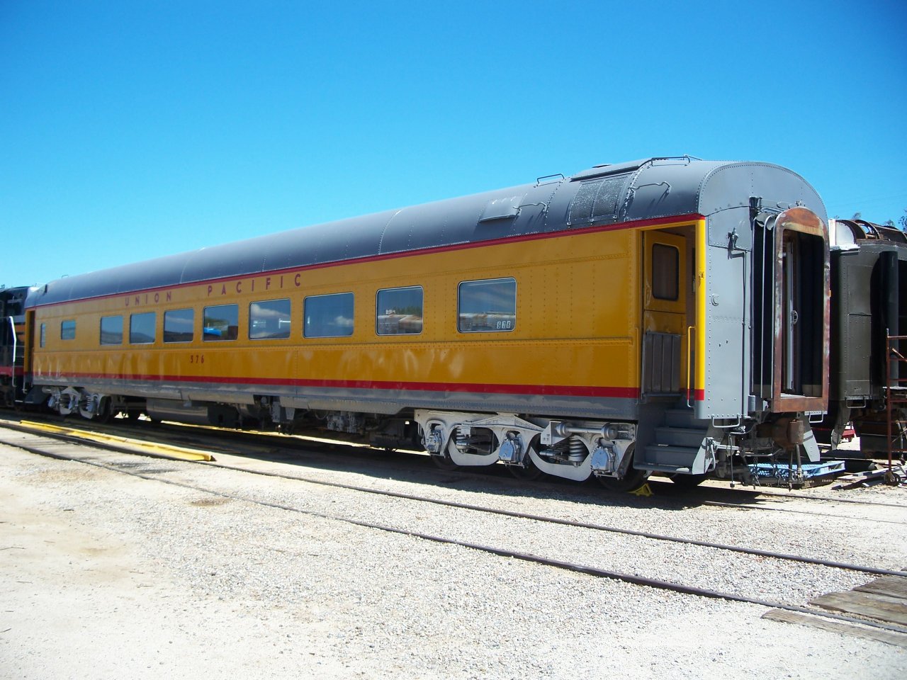 UP #576 was cleaned, repaired, and in mid-1977 repainted Pullman green, because no supply of the Armour yellow paint was available. In late 1980 it was again refurbished and repainted Armour yellow. UP #576 was moved to La Mesa depot in September 1981, exhibited, and used on the La Mesa Cannonball May 23, 1982, the museum-operated first passenger train on SD&AE's El Cajon branch in 54 years. It went to Campo in July 1983 on the museum's first "Great Freight", on which it unexpectedly served as an overnight coach. It was used on the first museum SD&A excursion trains starting January 4, 1986. It's now used only in cool weather, as its air-conditioning can't operate effectively at the slow speeds of museum trains and it has sealed windows. Four similar cars, including UP #582 and possibly #577 are built into Solana Station Restaurant in Solana Beach,CA.