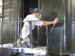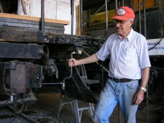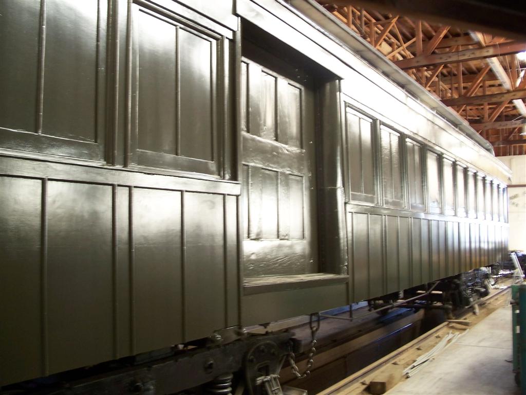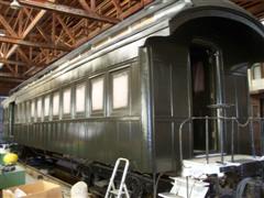 The car is being restored to its 1936-1945 Jim Crow years, when it operated as the Rockdale, Sandow & Southern's sole passenger car. Exterior restoration will be completed by the end of 2008, carried out by the Museum's 4-man restoration crew: Harold Whalen, Frank Stites, Bob Gerdes, and Ted Kornweibel, Superintendent of Restoration. The car's exterior was painted in September 2008 by master-painter Mark Gerdes. Interior restoration, including reupholstered seats and replica ceiling oil lamps, was finished in 2009. A $3,000 grant from the National Railway Historical Society, awarded in 2008, will help pay for recovering the seats and casting 90 replica pieces of clerestory glass. Now finished, the car is on view in the Display Building, accompanied by the Museum's African American railroad heritage display, the most comprehensive photographic exhibit about black railroaders in the country.