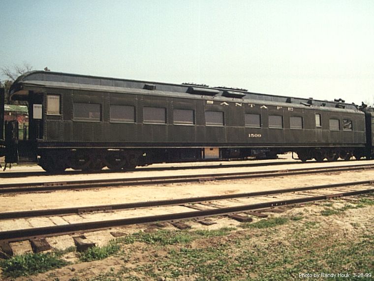 In 1973 ATSF #1509 was purchased by the PSRMA with a loan secured by member Jack Stodelle, which the PSRMA paid. From November 1974-August 1978, it was restored & painted Pullman green with black roof and cream and blue interior at the San Diego Marine Corps Recruit Depot and the Miramar Naval Air Station, and used on museum Miramar Chief trains, a 1976 Fallbrook trip, and on Amtrak trains to Los Angeles & Las Vegas at speeds up to 90 mph. In 1976 it was used in filming MacArthur at San Diego's Santa Fe depot. A truck smashed into and damaged its rear steps right after that. From 1978 to 1982 ATSF #1509 was in the PSRMA's Embarcadero exhibit in San Diego at Harbor Drive and B Street, except when on excursions. Moved to La Mesa depot, it was used on trips to El Cajon and Lemon Grove. In July 1983, it served as a crew diner on the first "Great Freight" to Campo. Used as a lounge car on trips to Miller Creek, San Diego, Jacumba, and Carrizo gorge (where its center frame was sprung on a tight curve in 1990), ATSF #1509 was in the 1987 film A Time of Destiny. It's now being renovated for further service.