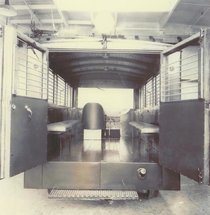 two above the front axle and four above the rear axle. It has a 4-cylinder 40 hp Ford Model A gasoline engine, and a Ford AA truck transmission with Fairmont Reverse gearbox, providing four forward & four reverse speeds. The car has two side doors and a rear one, hand-operated windshield wiper, a center-mounted jack on which it can be raised and turned around, one rear and two front headlights, interior & marker lights, and a vinyl bucket seat for the operator.