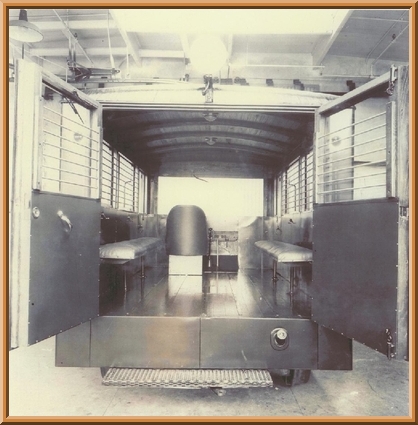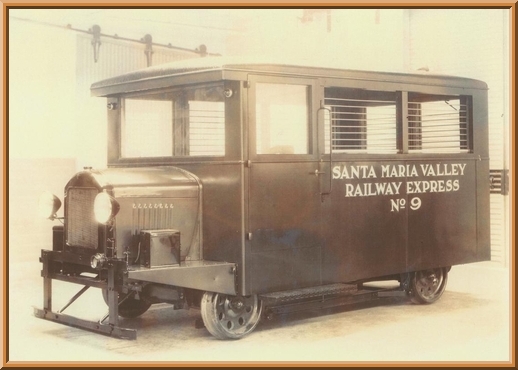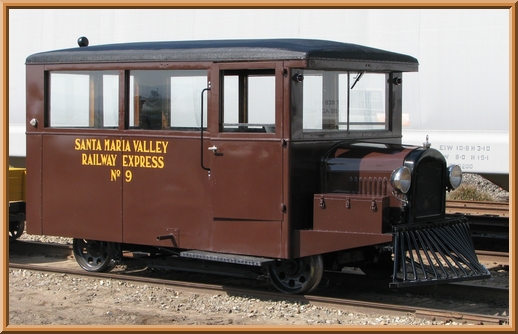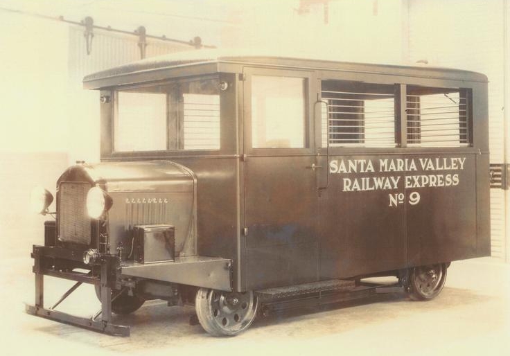 Although designed to carry twelve people on two 6-seat padded side benches, the car was purchased mainly for mail and express service by the Santa Maria Valley Railway, which numbered it SMV #9. An iron safe was placed in the car, which was so heavy that if not in the center when the car was turned on its jackscrew, the car might topple over! It ran on SMV's 18-mile line from a Southern Pacific connection at Guadelupe to Santa Maria & Gates Station,CA. SMV #9 never ran faster than 35 mph or carried revenue passengers, though it reportedly transported undocumented workers to pick vegetables & fruits. In strawberry harvest season, it often pulled one or two four-wheel trailers. SMV #9 also served as an inspection car and auxiliary section car. It was retired from regular service about 1936, painted orange, and used in some maintenance-of-way service until 1962, when sold because of excessive engine repair costs to the Valley Pipe & Salvage Company of Santa Maria for scrap. Its radiator, drive shaft, and some other parts were removed and sold.