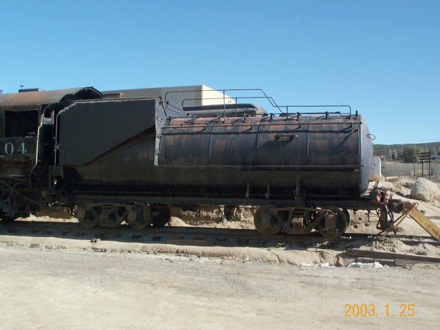 This Class C-8 (Class C-57-22/30-192-S for its driver and cylinder size, and weight on drivers) is a 2-8-0 Consolidation road engine, builder's #23899. Originally weighing 206,800 lbs. (103.4 tons), 183,100 on its 57" drivers, it had a 200 lb. boiler pressure and 43,300 lb. tractive effort. A superheater added December 21, 1918 at Sacramento increased these to 216,700 lbs. (108.35 tons), 191,900 on drivers, 210 lbs. pressure, and 45,470 TE. It has 22" x 30" cylinders, Stephenson link valve gear, and is 38' 5 3/16" long, 10' 0" wide, and 15' 8 3/4" high. It originally had a "square" tender, replaced in 1940 by a Vanderbilt one weighing 67,600 lbs. (33.8 tons) empty and 174,300 lbs. loaded. Between 1951 and 1955 it received a Vanderbilt 90-C-6 (for water capacity/cylindrical shape) tender, #778, weighing 57,600 lbs. (28.8 tons) empty and 166,100 lbs. loaded, with capacities of 9,000 gallons of water and 3,535 of fuel oil. It's 34' 8 3/4" long, 9' 10 1/4" wide, and 12' 8 1/2" high.