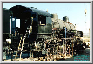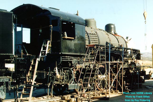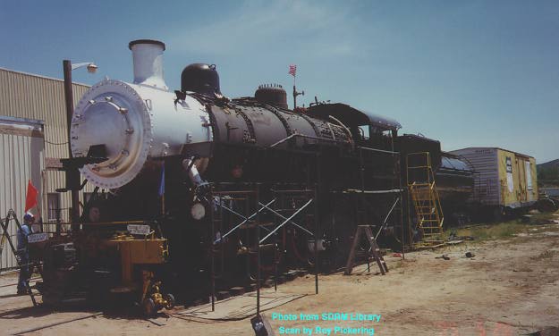The locomotive had been an excellent candidate for restoration: its out-of-the-way location in the hot, dry, valley had resulted in almost no deterioration from vandalism or the elements. Initial estimates to restore it to operating condition were relatively modest: under $40,000. After flues were removed, however, it was discovered that replacement of the front flue sheet was required, and that there were serious cracks in the firebox. Luckily, the owner of a San Diego boiler shop was sufficiently interested in the project to negotiate an attractive time-payment arrangement for the repairs. The boiler was removed and trucked sixty miles to the shop, where it remained for nearly two years. Meanwhile, the volunteer crew took full advantage of the exposed state of the running gear, rebuilding bearings, replacing broken spring leaves, etc. Finally, in May of 1994, boiler and frame were reunited. It still required over a year's sustained effort to get everything back together a full steam-up on August 12, 1995. First self-powered movement occurred February 9th.